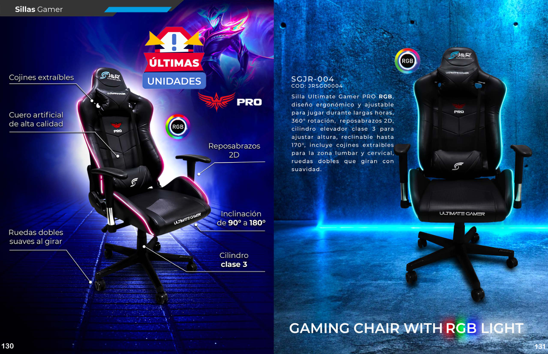 Las sillas gamer son asientos diseñados para comodidad y soporte ergonómico durante largas sesiones, con características como respaldos altos, soporte lumbar y cervical ajustable, reposabrazos adaptables y un diseño inspirado en los asientos de autos deportivos. Suelen incluir funciones adicionales como reclinación y, en algunos modelos, parlantes y luces LED para una experiencia más inmersiva.